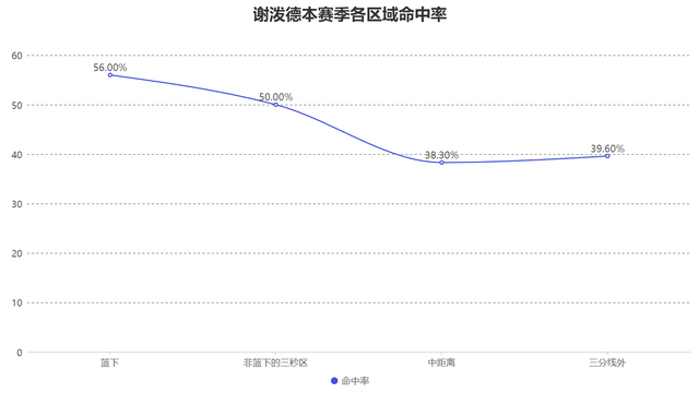 在篮下区域谢泼德的命中率仅有56%,这个数字看起来不低但在篮下区域命中率至少超过60%才算合格,并且作为投手他的中距离命中率仅有38.3%,整个进攻端只有非篮下的三秒区与三分线外达到优秀线,因此他进攻端最擅长的是突破到三秒区附近完成跳投与投三分,这样的进攻风格极为依赖手感和状态很难保持稳定。